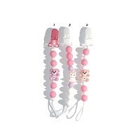 Attache tétine rose en perles silicone, avec figurine nounours ou licorne. La pince avec sécurité pour éviter que l'ensemble se décroche trop facilement. Le cordeau en nylon blanc habillé de perles et des double noeuds sécurisés. Terminé par une boucle rélisée avec le cordeau en nylon pour y accrocher la tétine. L'ensemble sur une longueur ne...